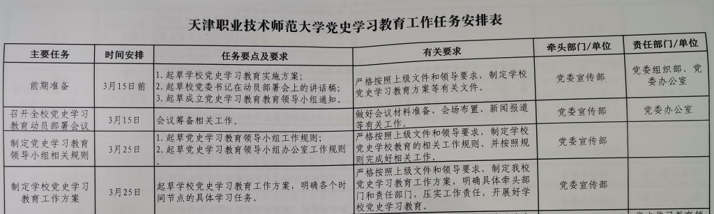 4是职司促成表。依照“规则行动没有走样,自选行动有特性,姑且行动没有迟误”的领导思维,拟定党史进修教导职业浑单、负担浑单,拟定每周中心工作促成表,建议义务诉求、清楚工作时限,推进黉舍党史进修教导步步为营、分步鼓动。